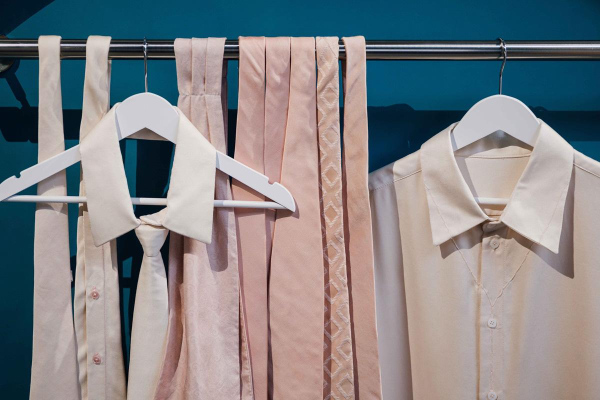 Ana Mendes, Salmon Pantone Collection, 2019-ongoing, mixed technique (second hand ties, custom made ties and shirt (AM x YJ&MP), natural dyes, wood bar, hangers), dimensions variable, exhibition view ‘Voir la mer’, MAIF Social Club, Paris, 2025. Photo courtesy of Jean-Louis Carli / MAIF